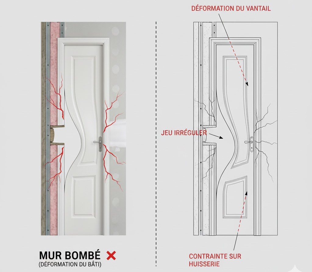 Une cloison légèrement bombée au centre suffit à désaligner un bloc-porte. Une cloison qui s’affaisse de quelques millimètres entre le haut et le bas du montant crée une torsion visible instantanément. Une cloison qui n’est pas d’aplomb transmet sa pente au dormant.